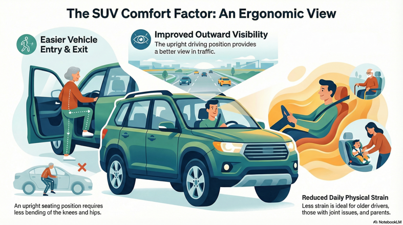 Then there is the biomechanical aspect - SUVs typically place occupants in a more upright seating position, with the seat base closer to standing height. This reduces the amount of knee and hip flexion required when entering or exiting the vehicle, which matters more than many people realise, particularly for older drivers, those with joint issues, or parents repeatedly lifting children in and out of car seats.