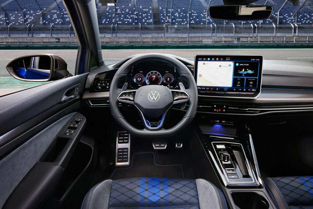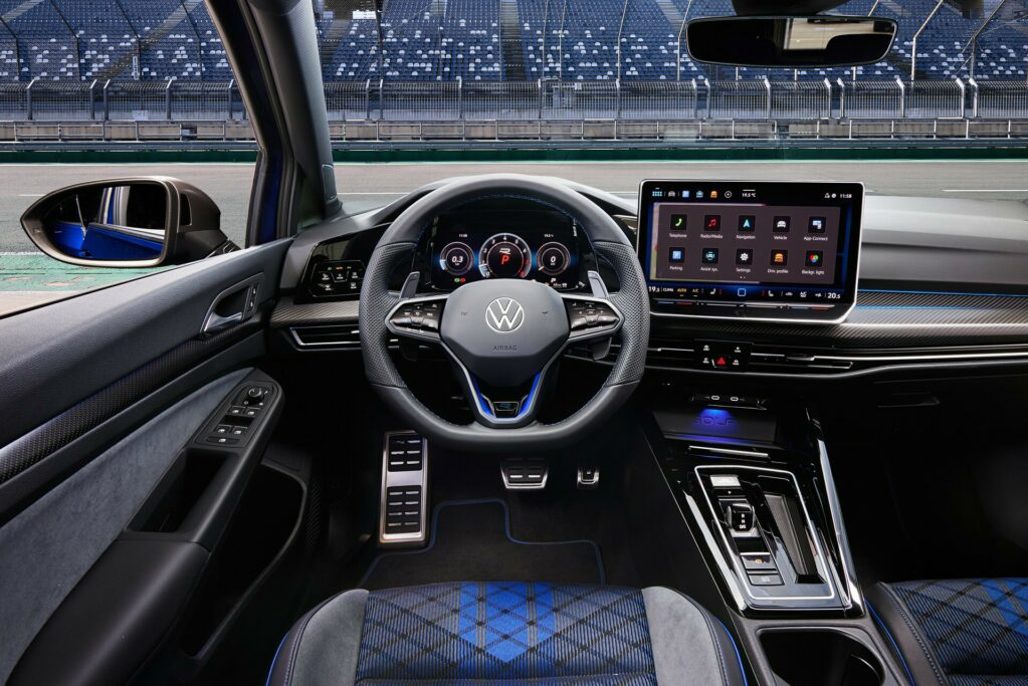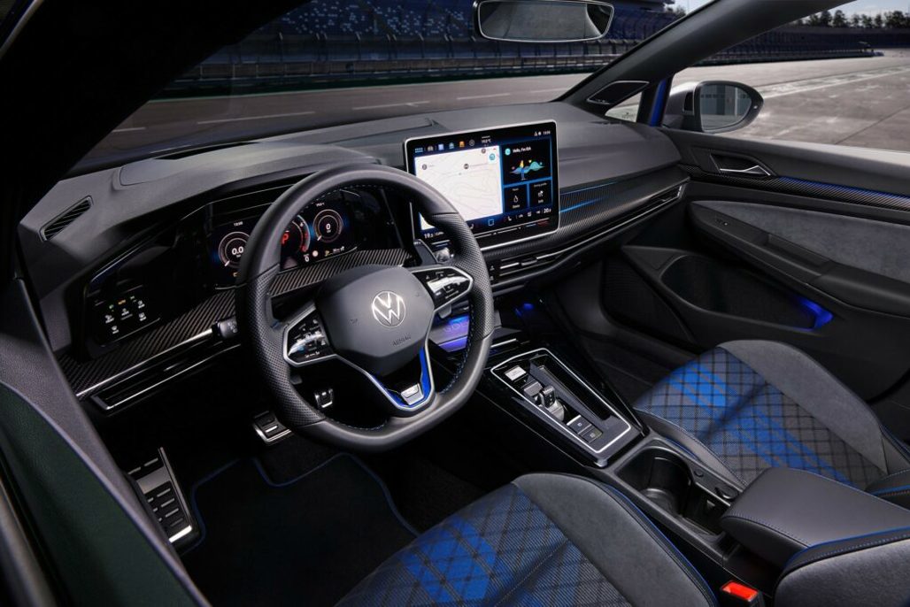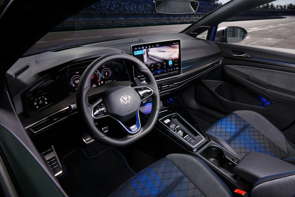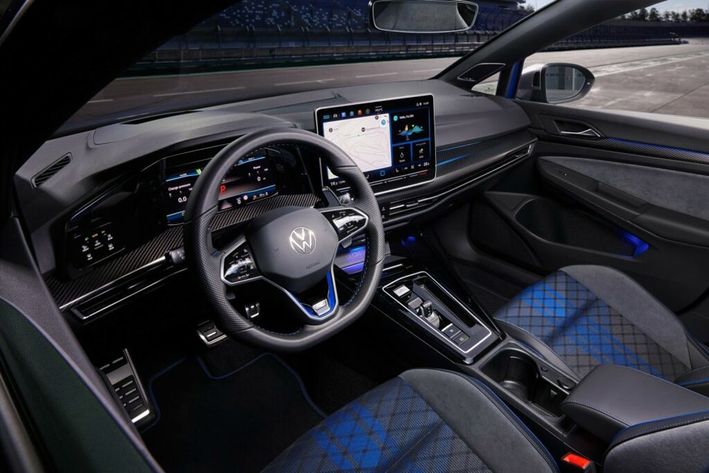 Inside, the Golf R is equipped with a 12.9-inch infotainment system, featuring an intuitive menu structure and improved graphics. The driver’s cockpit includes a 10.2-inch digital instrument cluster, which now boasts G-metre and GPS lap timer displays for Performance package models.