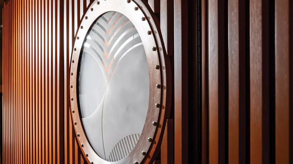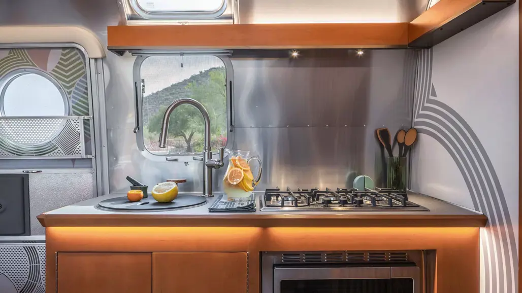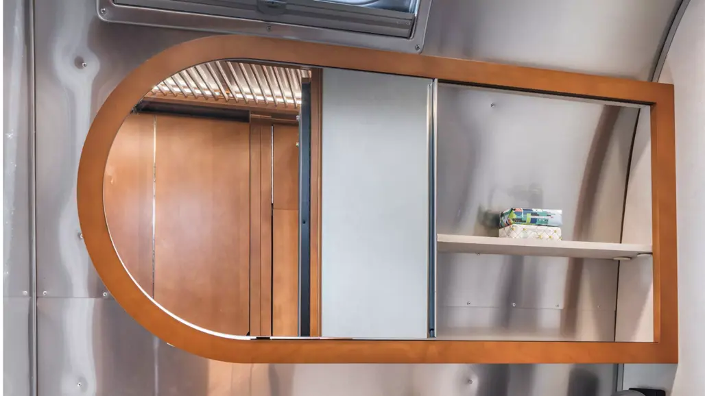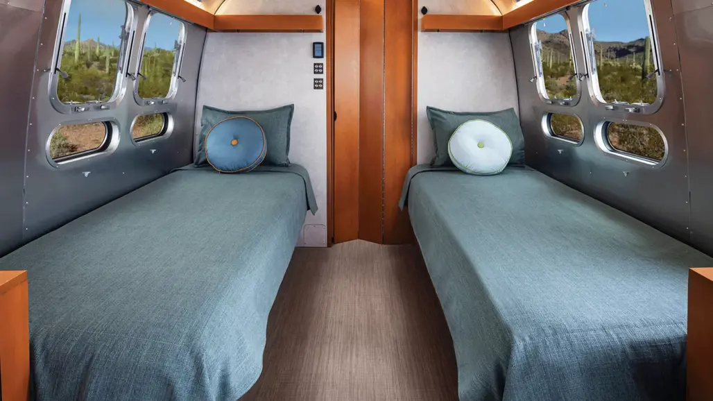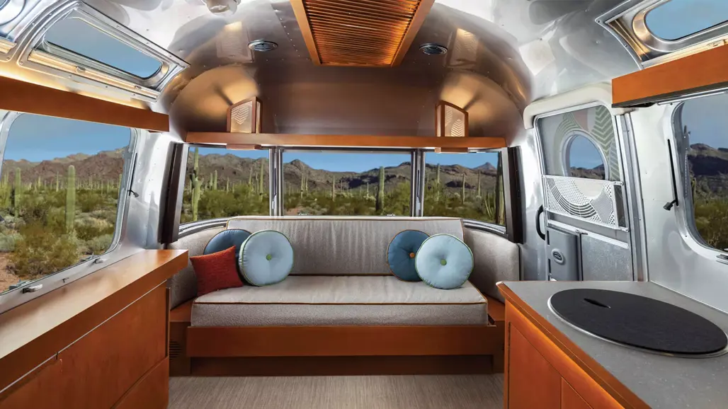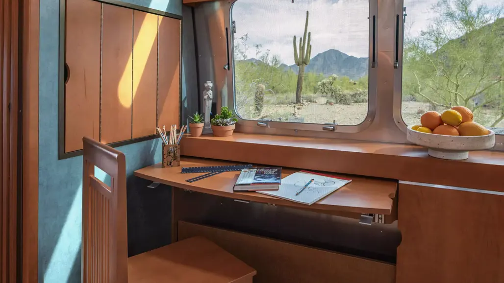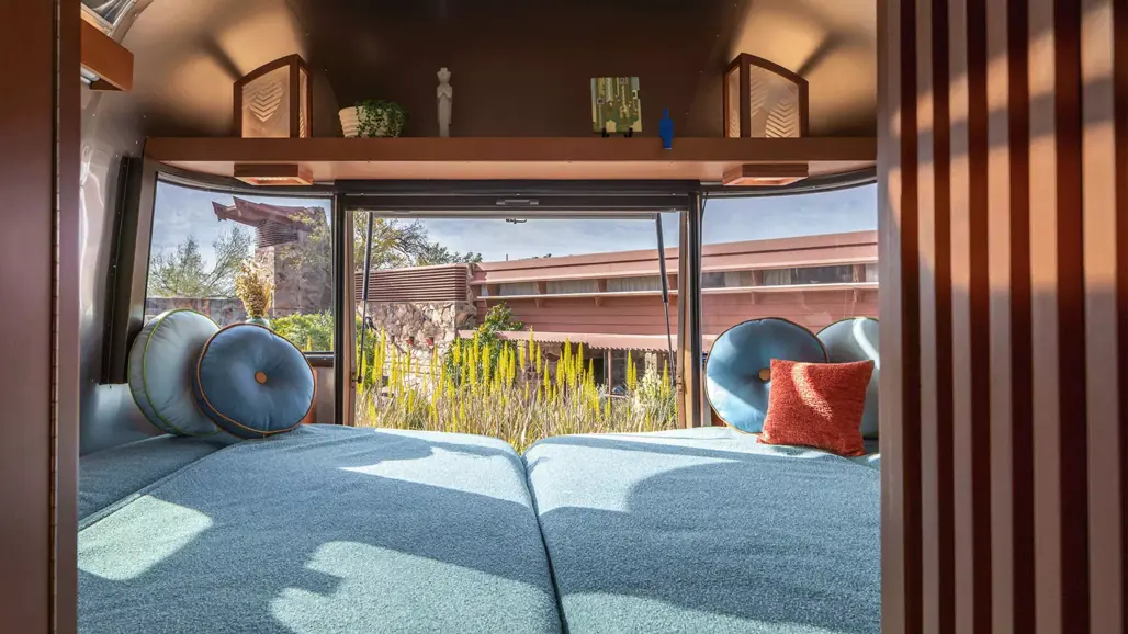 The Usonian isn’t just borrowing a name. It leans heavily on Wright’s architectural ethos (living in harmony with nature) by letting the outside in. The cabin has more windows than your typical Airstream, including a pair of portholes that nod to Wright’s fascination with circular shapes. The result is an airier, brighter interior that still manages to feel sleek and self-contained.