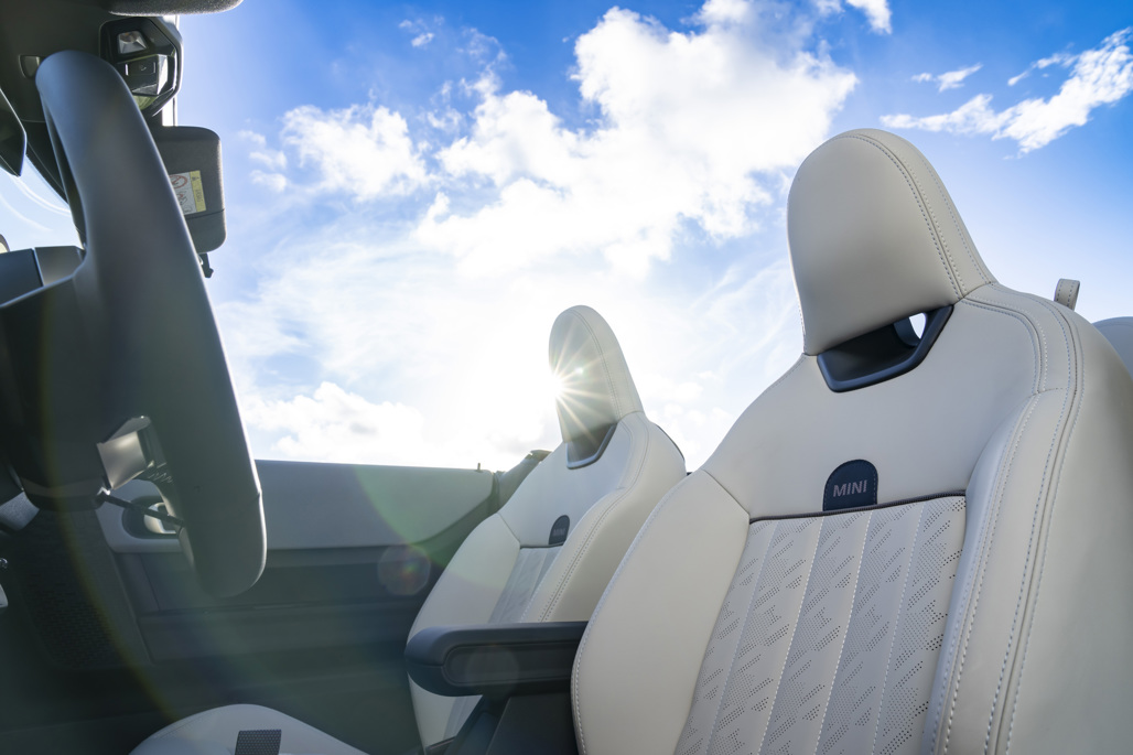 Inside, the Mini Cooper Convertible focuses on simplicity with its 'Charismatic Simplicity' design language, featuring minimalist details and refined materials.