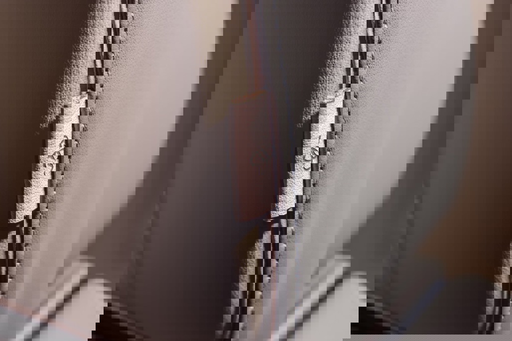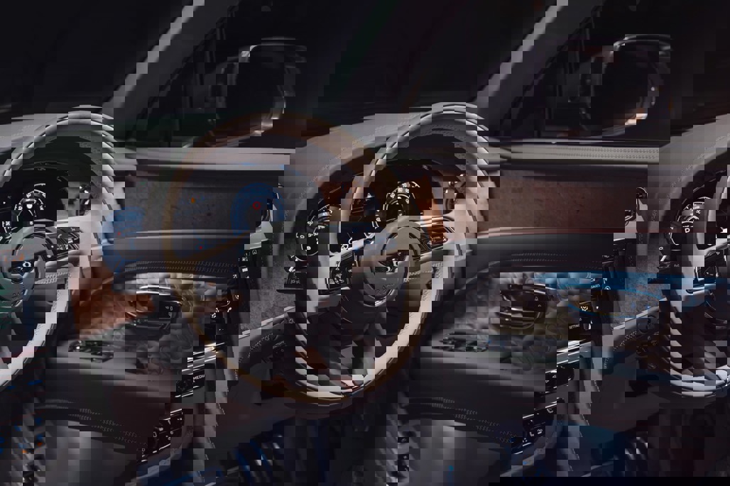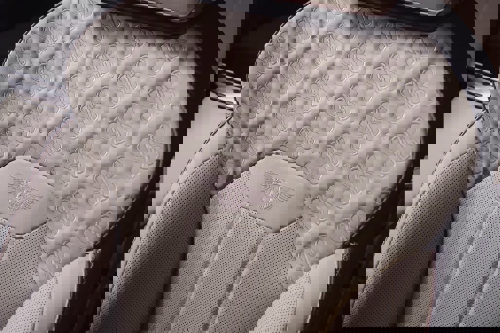 The Standard specification is the softer of the two, pairing an Anthracite exterior with a cabin trimmed in Gravity Grey and Linen hides, Autumn Stone and Piano Linen veneers, plus Powder Pink accents through the piping, embroidery and painted veneer pinstripes.