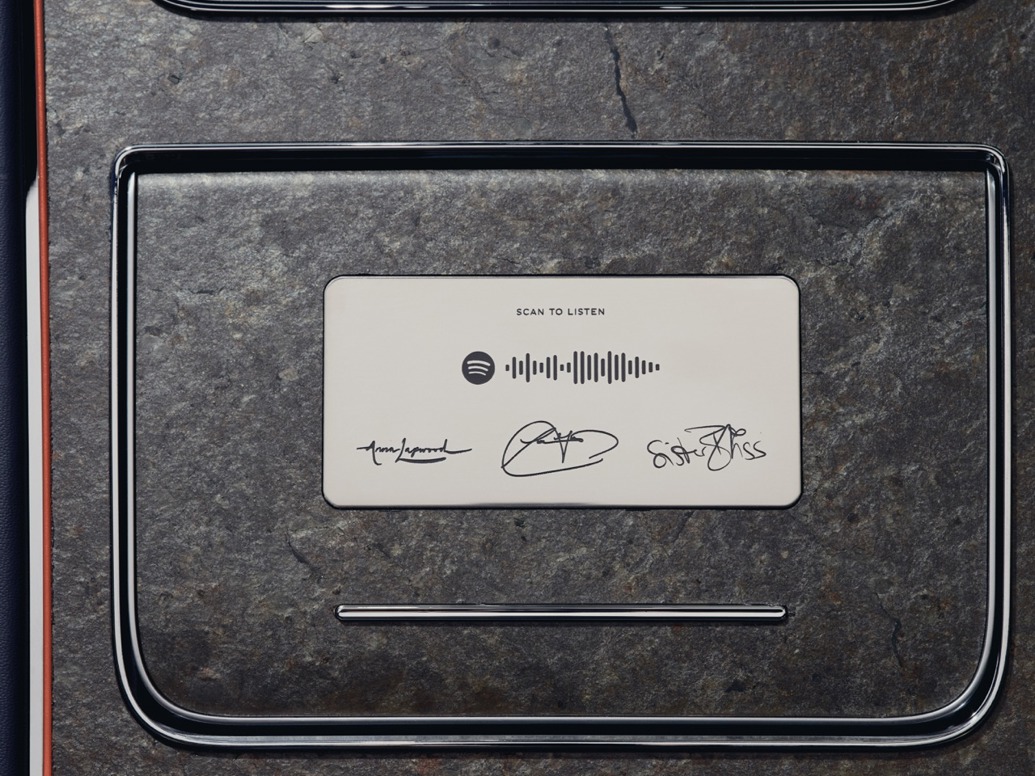 Perhaps the most modern flourish sits on the centre console: a polished plaque bearing the artists’ engraved signatures and a Spotify code. Scan it and the car jumps straight to a playlist curated by the three musicians, ready to play through the Bang & Olufsen sound system with gold-and-black speaker grilles.