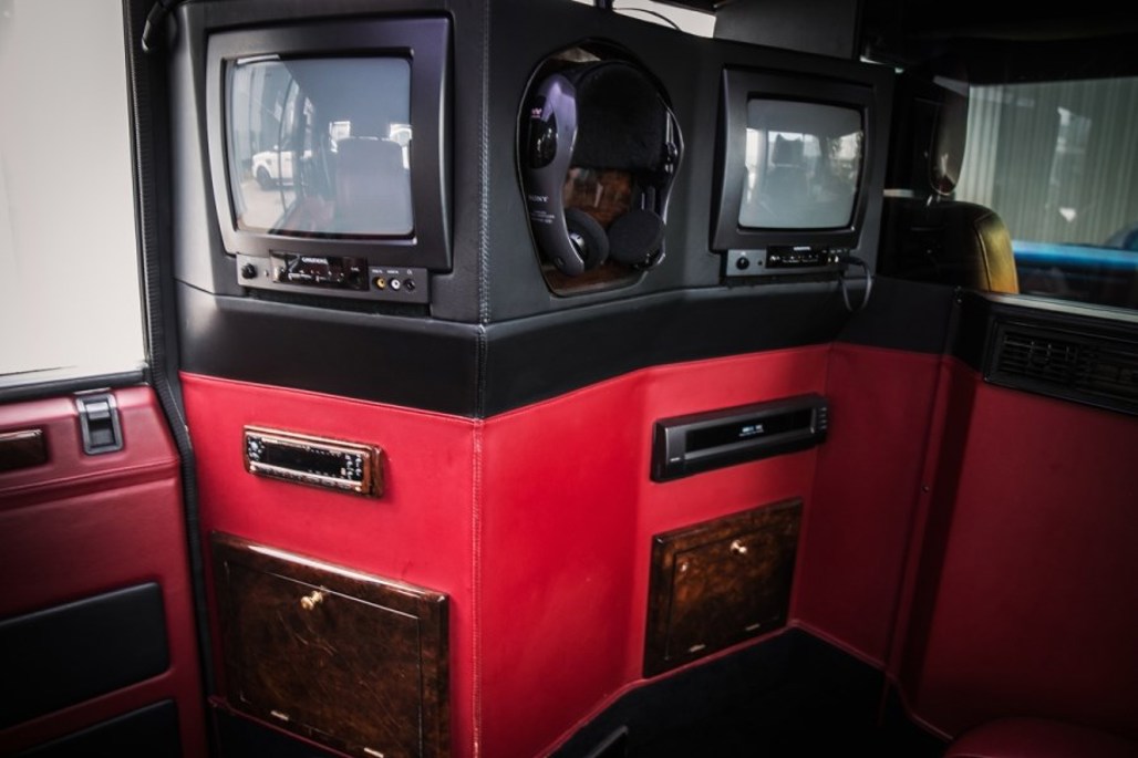 Besides the over-the-top red leather upholstery, the second most remarkable part of the interior is the fact that all of this tech was installed near the end of its time. The CRTs were about to be replaced by flat screens, and the VHS tapes were set to be phased out by DVDs.