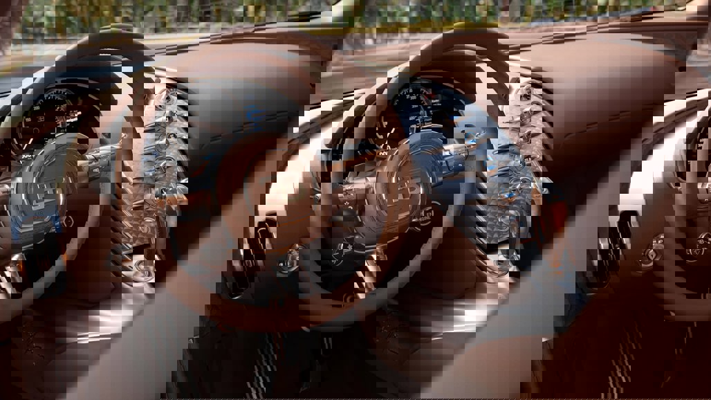 Inside, Bugatti calls it a near-total rethink versus recent W16 models, with a circular, Bauhaus-style steering wheel and a bespoke centre console and tunnel cover machined from solid aluminium blocks.