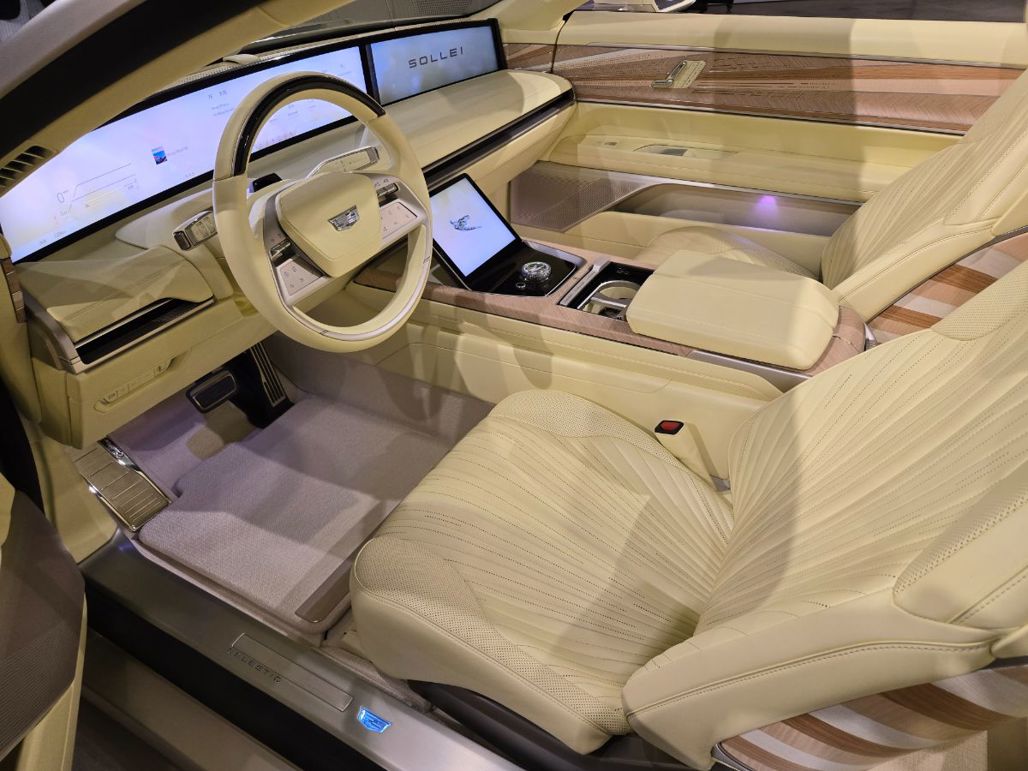 That colour is a reboot of a classic Caddy hue from 1957-58, Manila Cream. Sun-themed features are used throughout: Nappa leather with colour-changing sunrise effect, “Aurora” tint on the metallic surfaces, sunburst quilting and woodwork, and a metallic roof fabric called Daybreak. The wood finishes are hand-cut and open-pore.