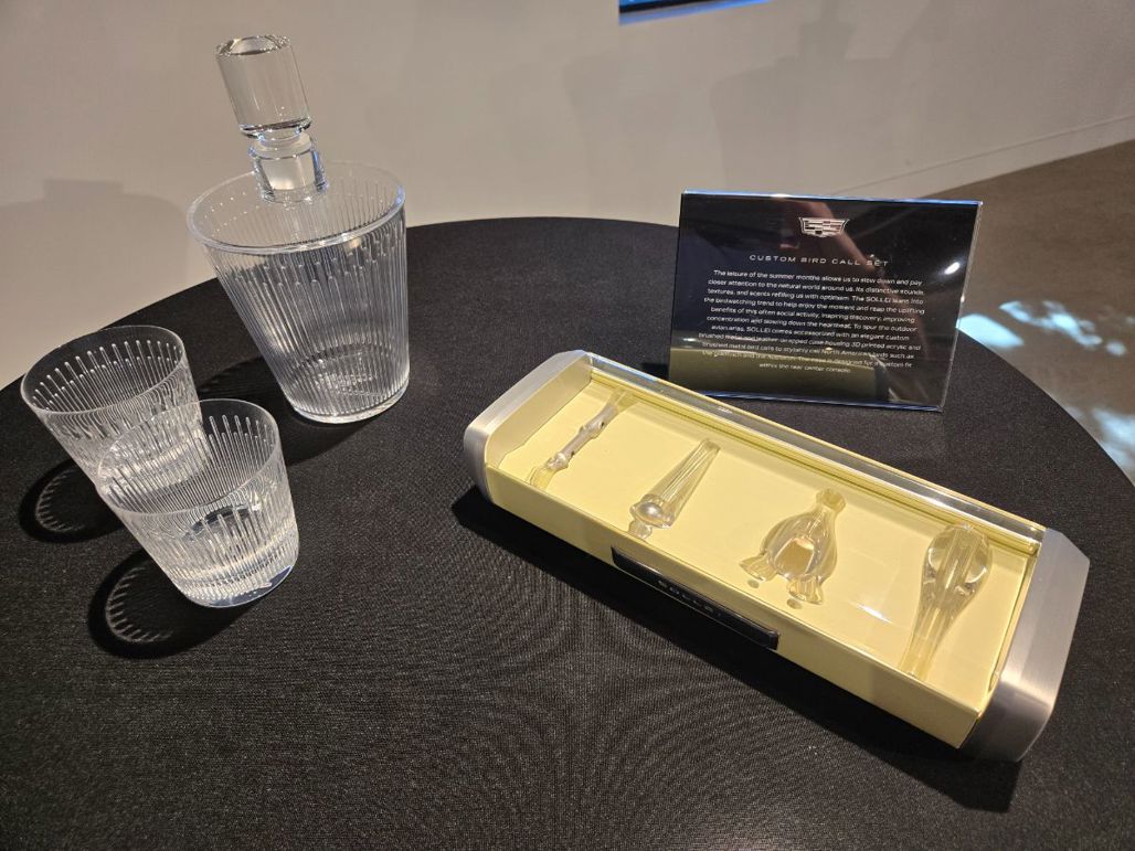The car is all about “elevating the travel experience” for all occupants, says Cadillac. Right down to an integrated beverage chiller with power glass door and crystal glasses.