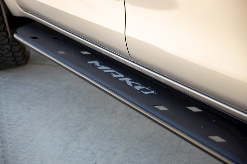 There are extensive body modifications including front steel bulbar with integrated LED lightbar, unique fender flares, side steps with “Mako” logos, T Custom Sports Guard non-slip deck liner, soft-close tailgate and heavy duty rear step bumper.