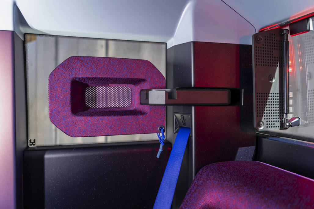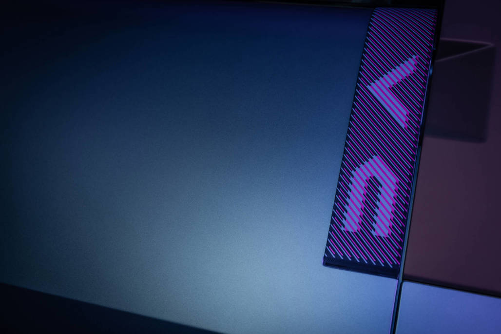 The exterior is pure function: no overhangs, a horizontal nose with slim headlights and rear doors opened by simple straps instead of handles.