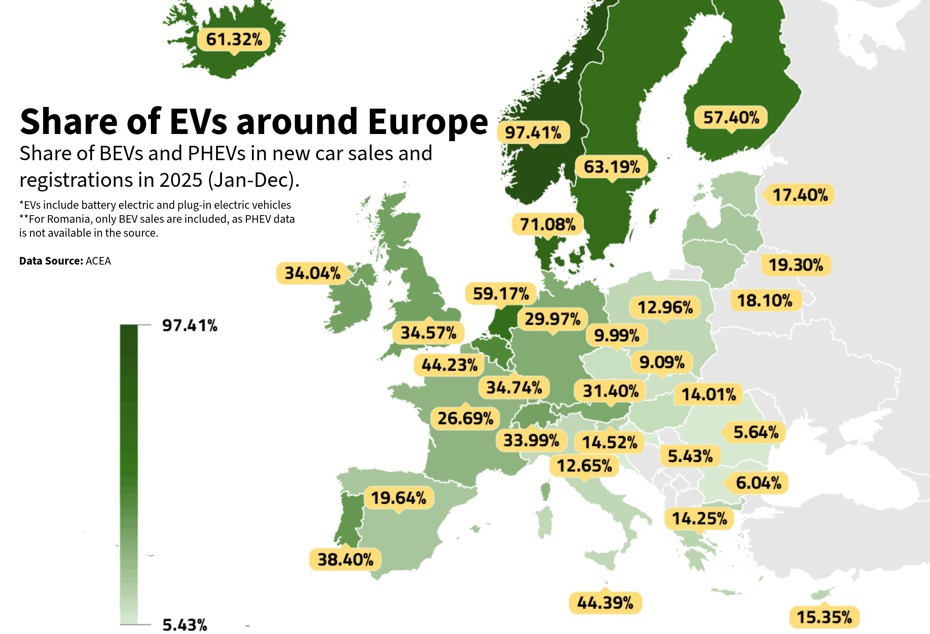 A total of 3.86 million new electric vehicles (EVs) were registered across Europe in 2025, a surge that sees electric models now account for more than a quarter of all new car registrations across Europe.