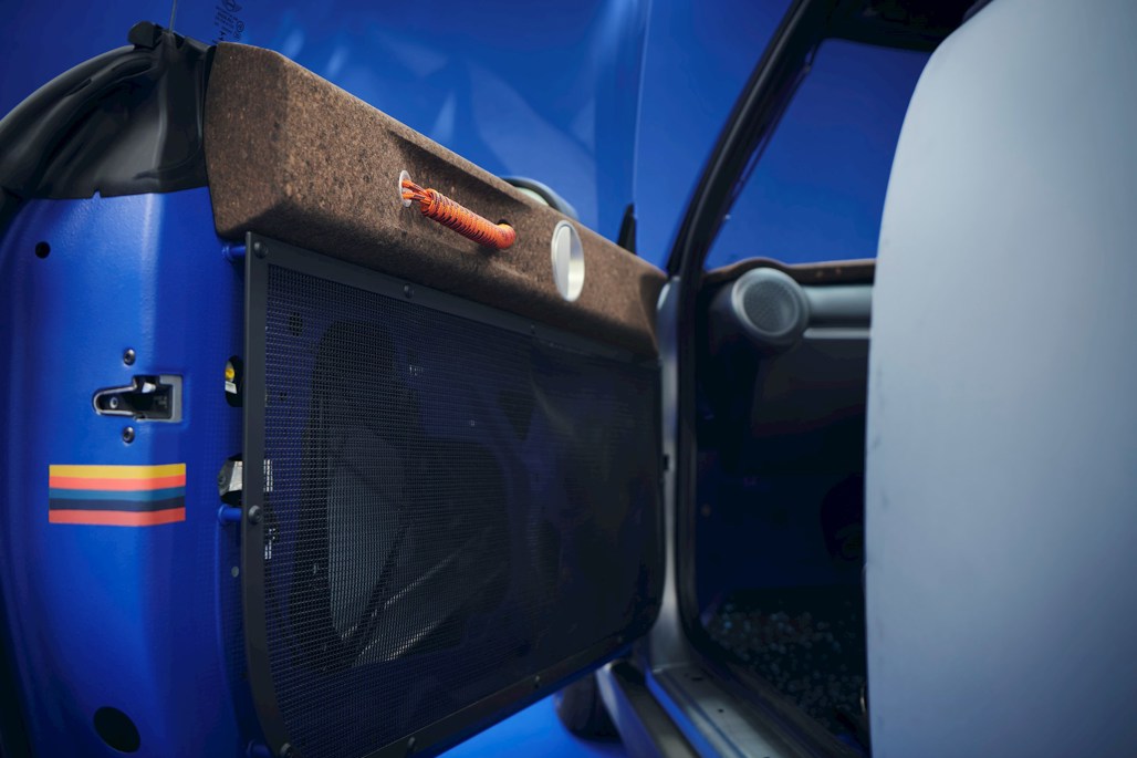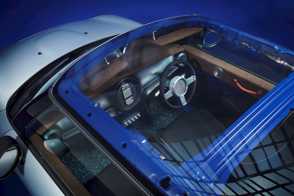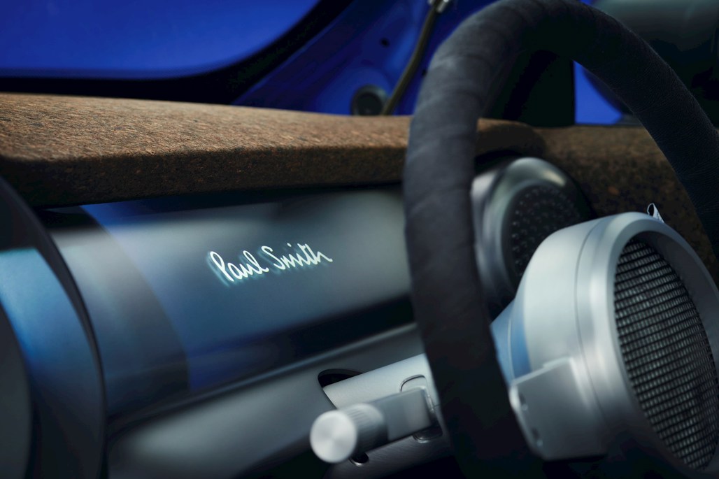 Open the doors and there's signature Paul Smith stripes in five colours; the charging flap adds a splash of neon green when opened, while the engraved drawing of an electric plug on the flap is Smith’s own work.