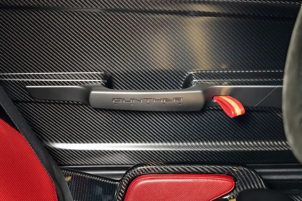 The carbon fibre bodywork draws heavily from the Gunther Werks Turbo, ditching the traditional ducktail in favour of a large fixed rear wing.