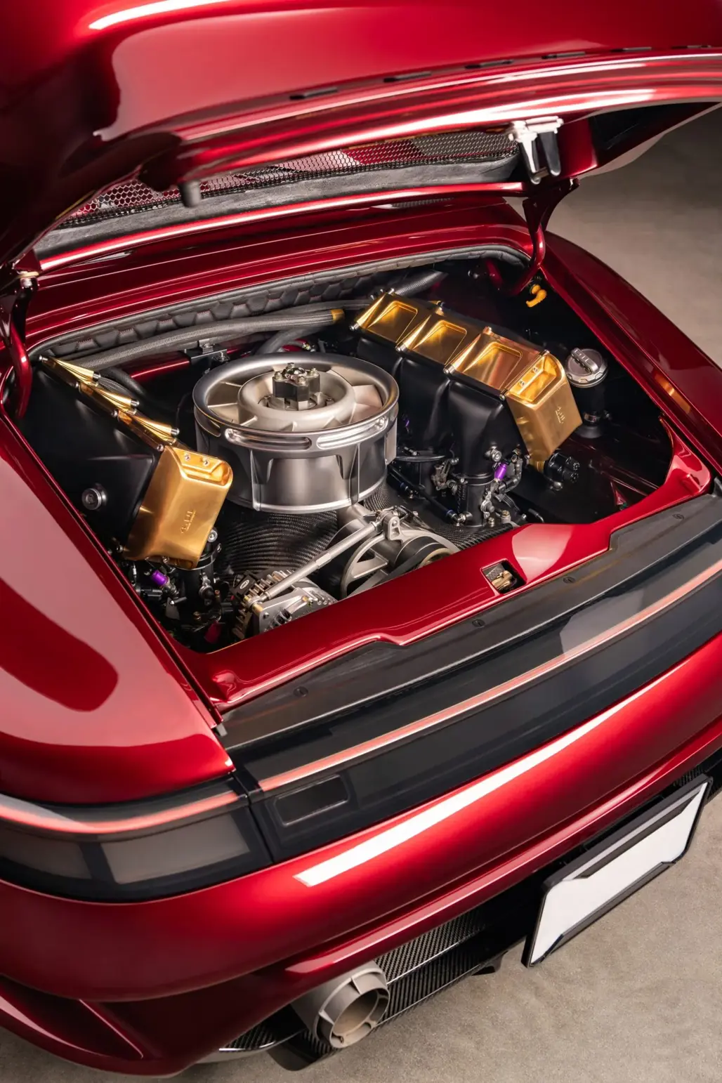 A flat-fan system handles cylinder cooling, while air-to-water intercoolers are wrapped in 24-karat gold, because at this level, restraint isn’t really part of the brief.