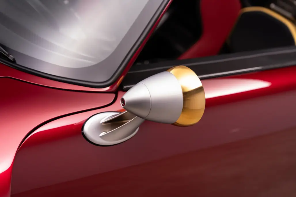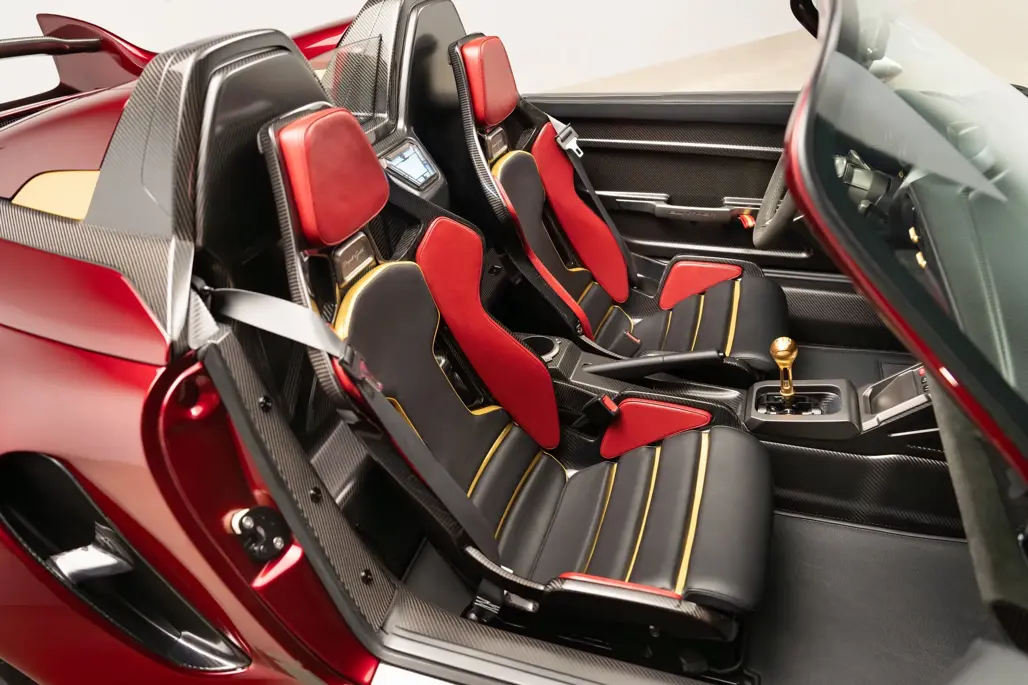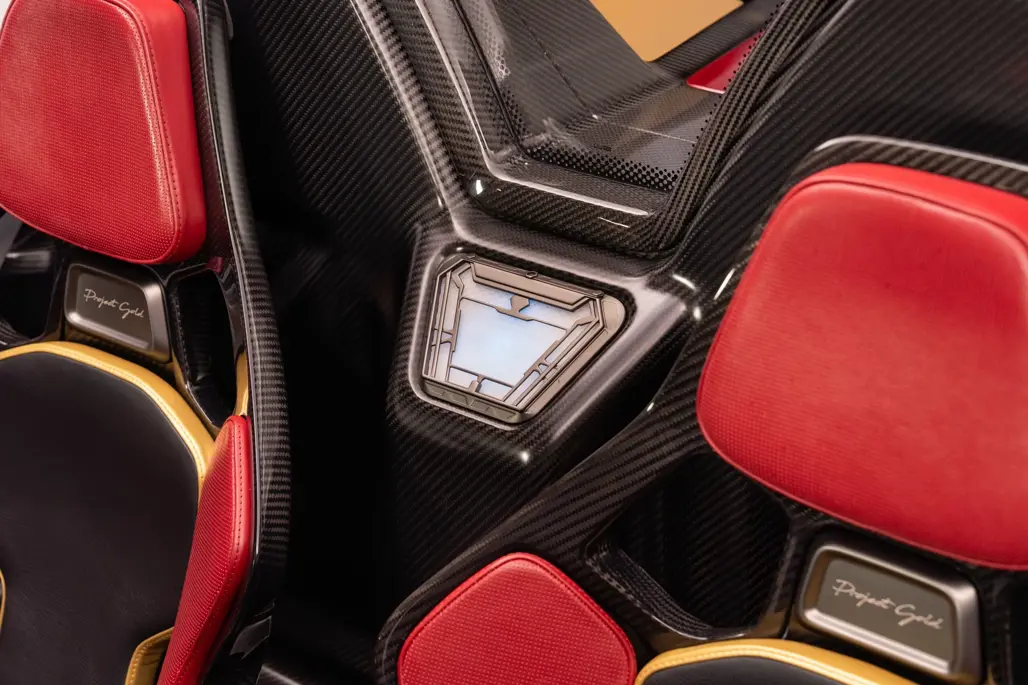 Carbon-backed seats, matching red and black leather, and further gold detailing round out a cabin that feels more like a showpiece than a place to quietly go about your driving.