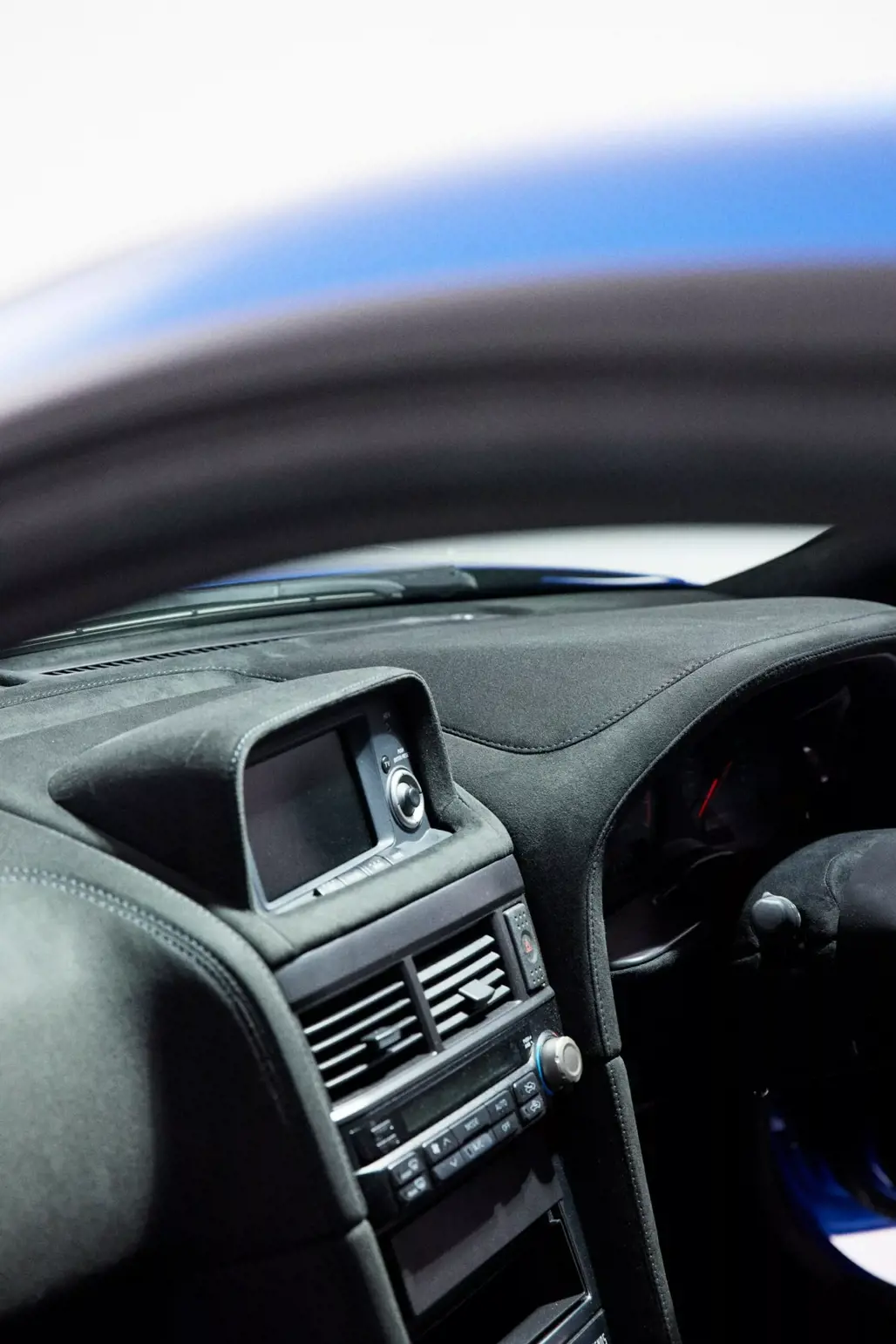 The R34’s interior matches the sleek exterior aesthetic, featuring two-tone black and navy Ultrasuede across the seats and interior panels.