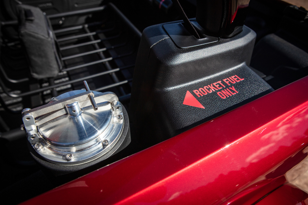Its Poison Apple Red paint scheme and custom features, including a race-style fuel filler door and red-tinted bikini top, make it a modern classic in the making.