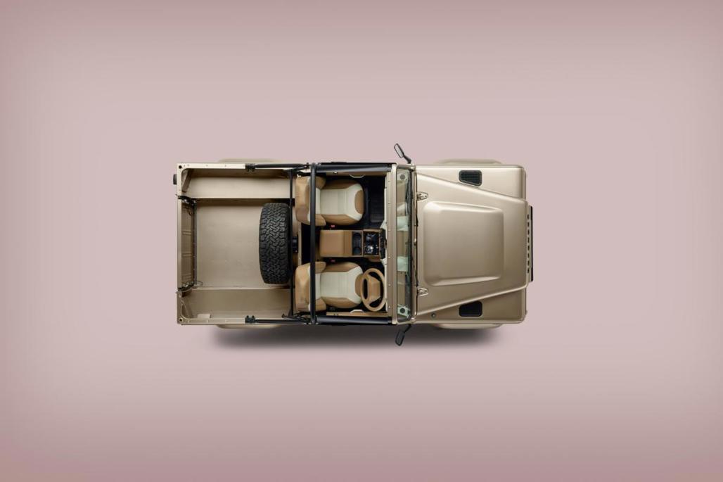 The bespoke canvas hood is available in four colours: Black (standard), Sand, Dark Khaki, and Navy, and its design is inspired by the hood fitted to the last original Defender produced in 2016. It includes authentic tie downs and webbing, while the side and rear sections can be unzipped and rolled-up for open-air driving while retaining some protection. Extra tie-down points have been added for open road speeds and smaller ‘Bikini Hood’ is also available in the same colour range, protecting front-seat occupants. Sort of.