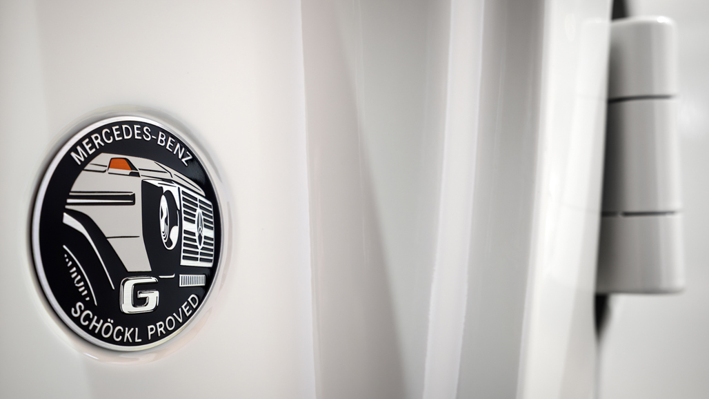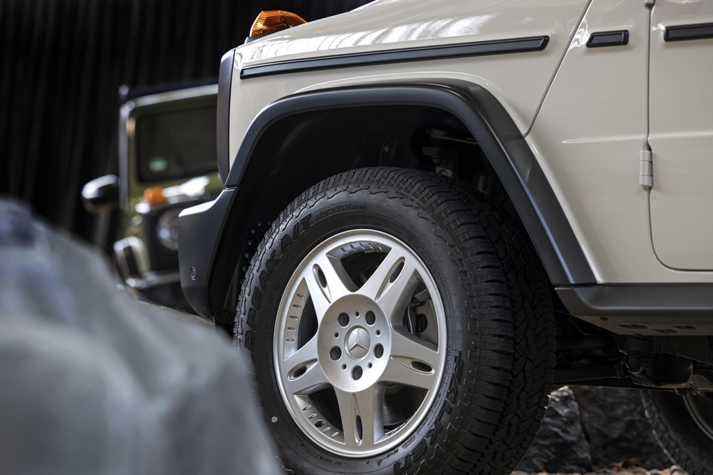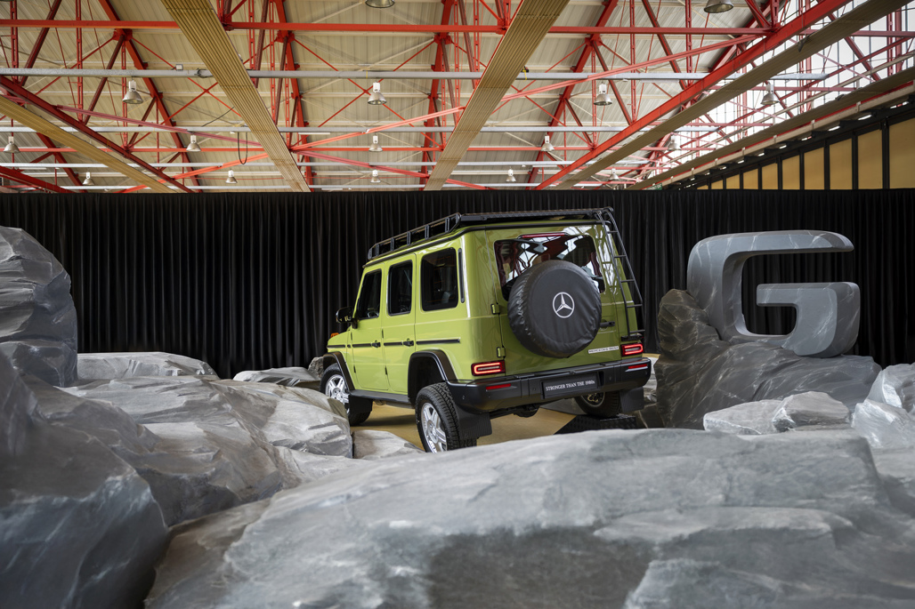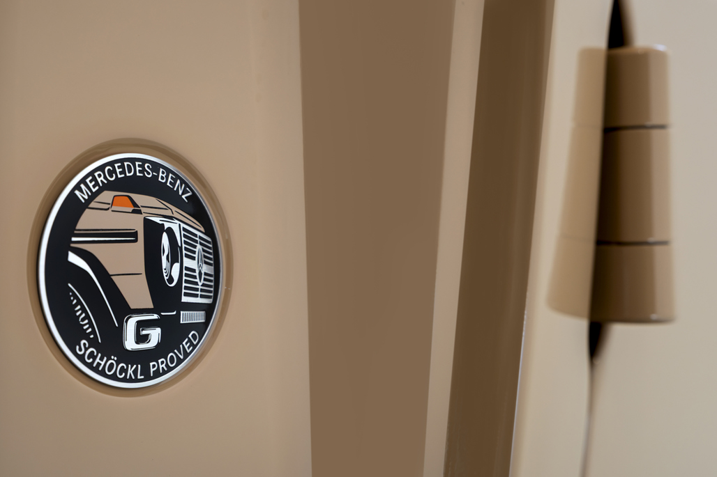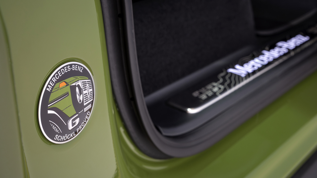 Equipment from the Professional Line Exterior package, including headlamp grilles, front and rear mud flaps, and optional roof rack, reinforces the G’s off-road credibility. A Manufaktur logo projection beneath the side mirrors displays the message: “G - Stronger Than Time”.