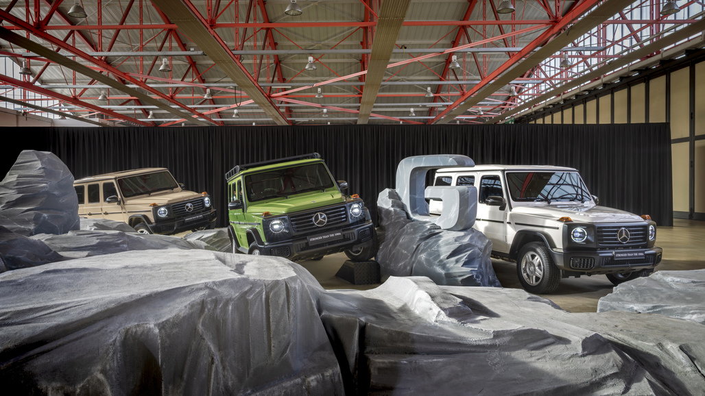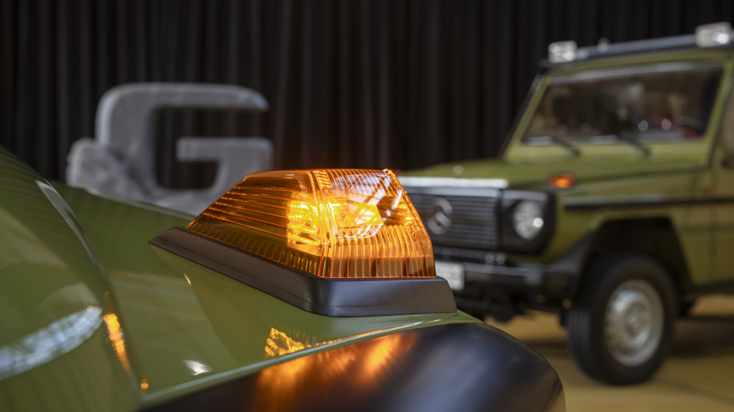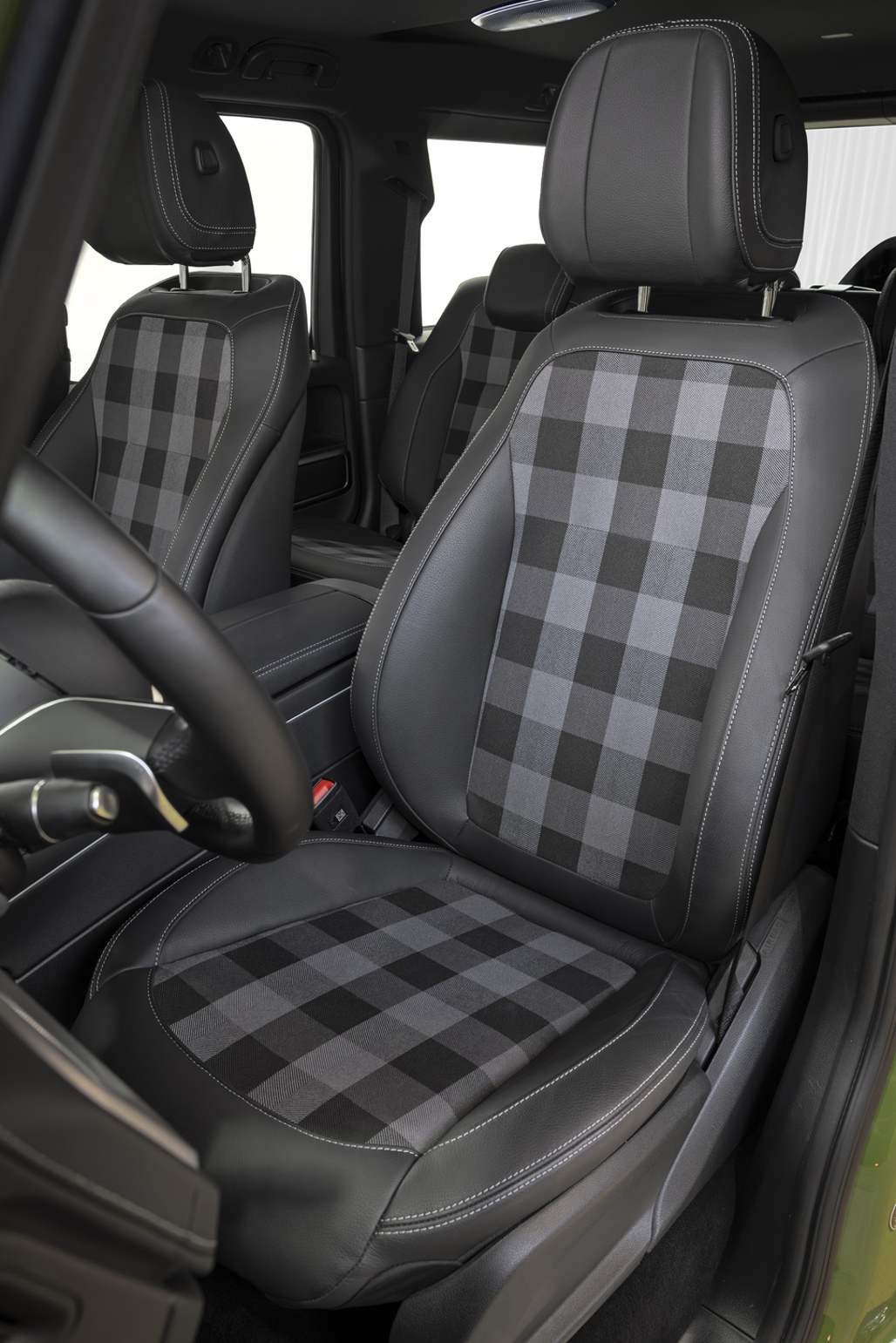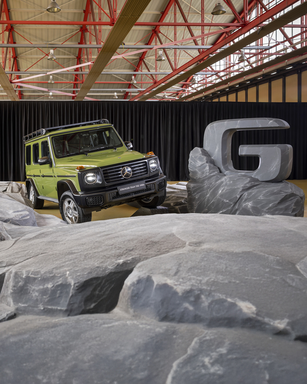 Equipment from the Professional Line Exterior package, including headlamp grilles, front and rear mud flaps, and optional roof rack, reinforces the G’s off-road credibility. A Manufaktur logo projection beneath the side mirrors displays the message: “G - Stronger Than Time”.
