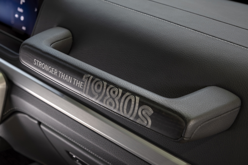 The trim on the grab handle reads “Stronger Than the 1980s”, while the standard kit includes a glass sunroof, Nappa leather steering wheel and Burmester 3D audio.