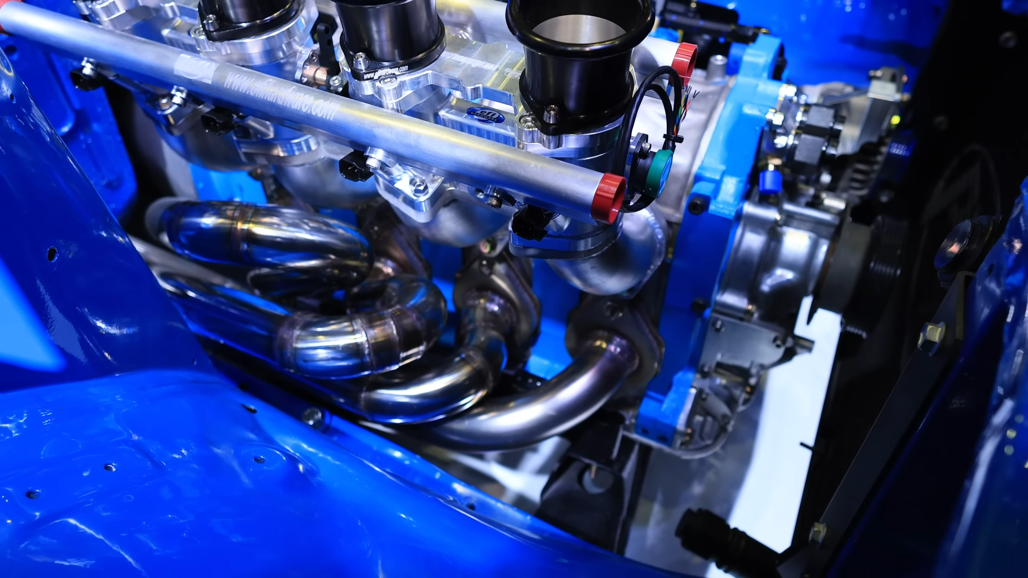 The interior features custom Bride seats, a roll cage and a metal dashboard, strategically positioned to improve weight balance.