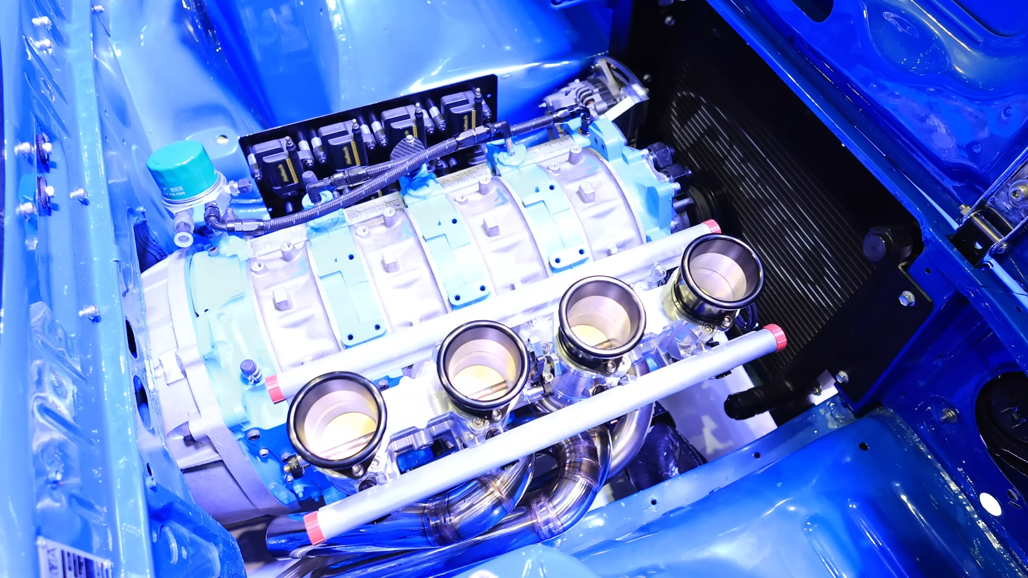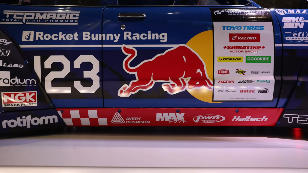 The car's restoration includes a Rocket Bunny widebody kit, which retains the functionality of all doors and the rear hatch. It sports custom two-spoke front wheels with the Mad Mike logo, wrapped in Toyo R888R tyres.