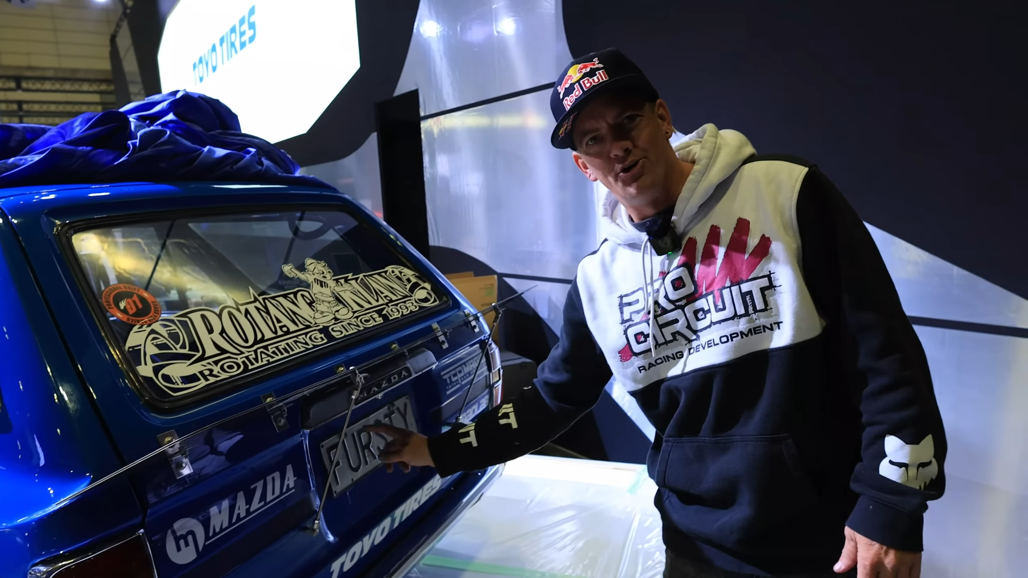 Beyond the RX-3, his garage includes the RADBUL, a Mazda NC MX-5 with a 26B quad-rotor, twin-turbo engine, and the RUMBUL, a Mazda B2000-based Stadium Truck with a naturally aspirated 13B twin-rotor engine.