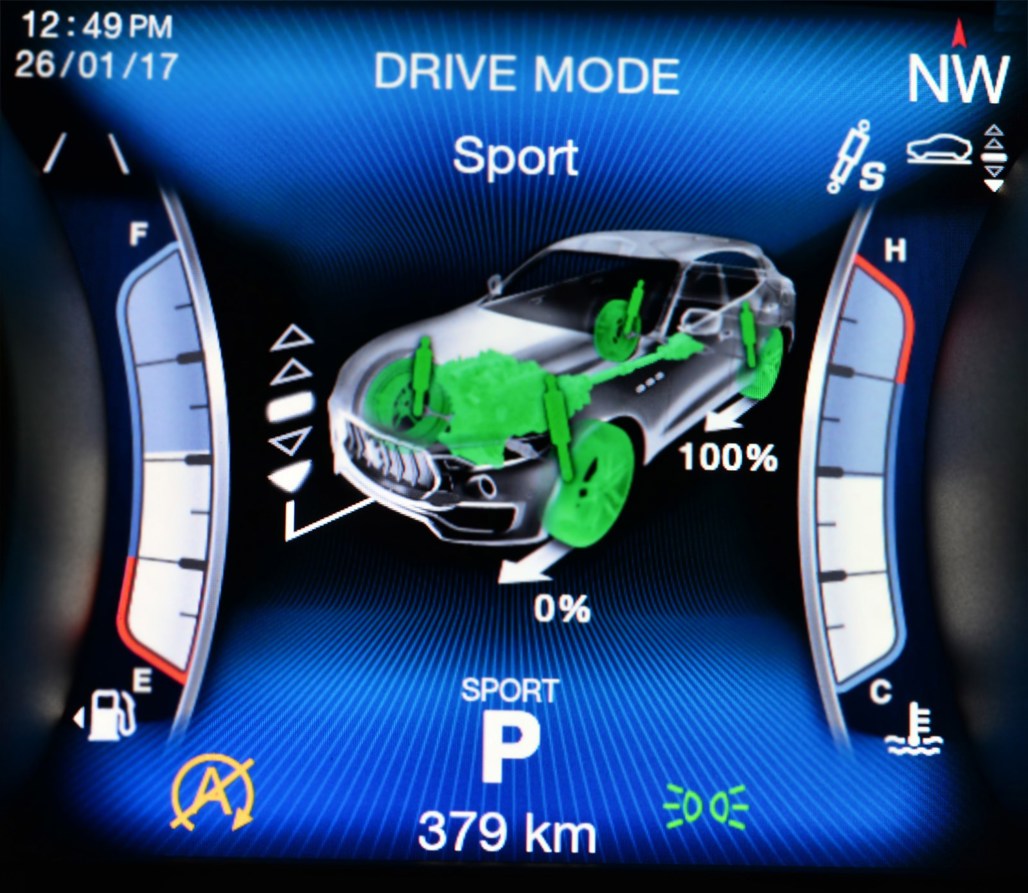 It has the same 50:50 weight distribution as the Ghibli, while having five heights and ride height plus four drive modes: normal, sport, off-road and ICE.