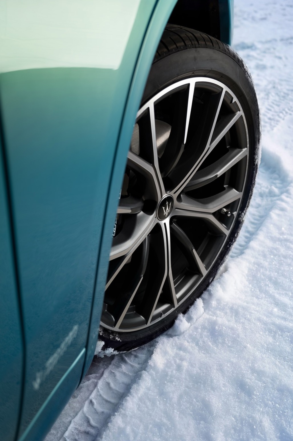 The paint isn’t flying solo either. The Cristallo gains a bespoke grille with matching Azzurro Aureo inserts, 21-inch diamond-cut alloy wheels, self-levelling hubcaps and Maserati-branded valve caps — small details, but enough to mark it out from a regular Grecale.