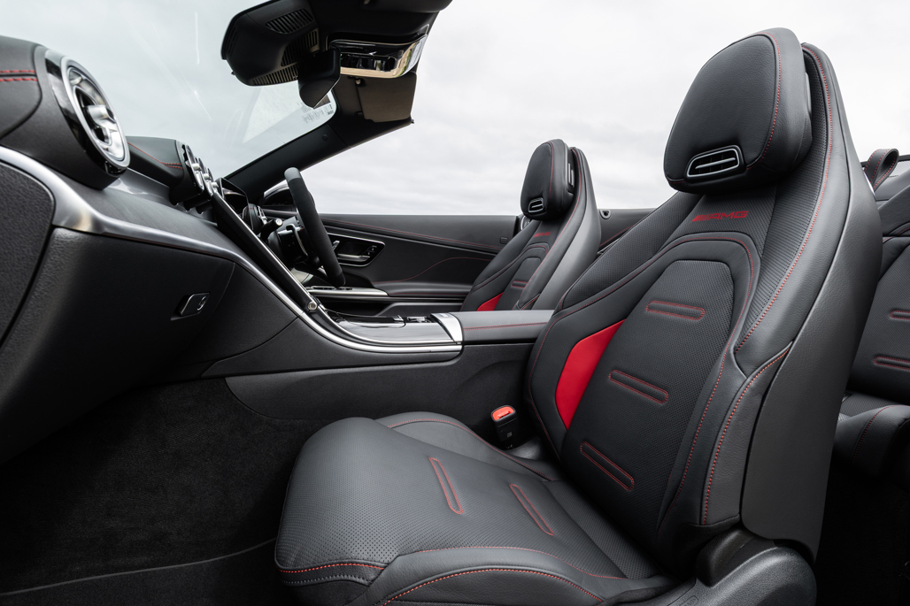 The portrait screen tilts electrically to cut glare when the roof’s down. AMG-exclusive themes, telemetry, and a Supersport layout bring a motorsport-inspired feel.