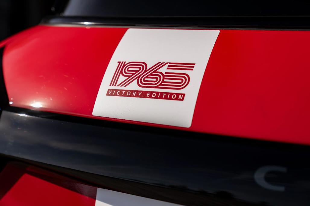 The exterior of the 1965 Victory edition is finished in Chili Red paintwork, with a white bonnet stripe that continues across the roof and rear of the vehicle. Design elements referencing the 1965 rally car include a white “52” graphic on the sides and a "1965" badge located on the C-pillar.