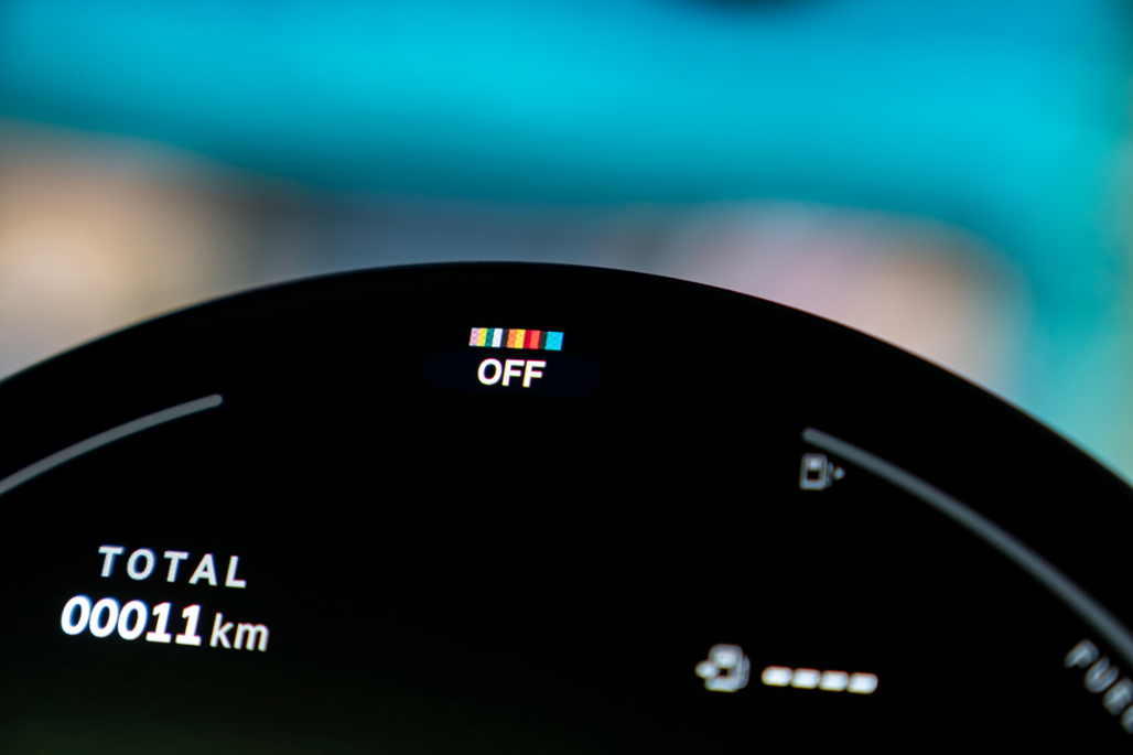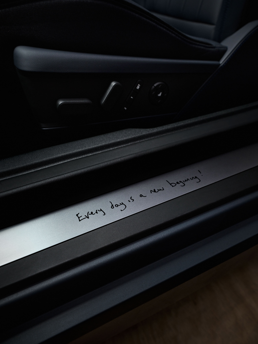 Knitted black surfaces on the dashboard and door panels are inspired by Paul Smith’s tone-on-tone stripe patterns and fabrics, while Nightshade Blue sports seats in Vescin feature knitted textile inserts on the shoulder and headrests. Decorative stitching on the steering wheel adds a pop of bright colour, in the Paul Smith style.