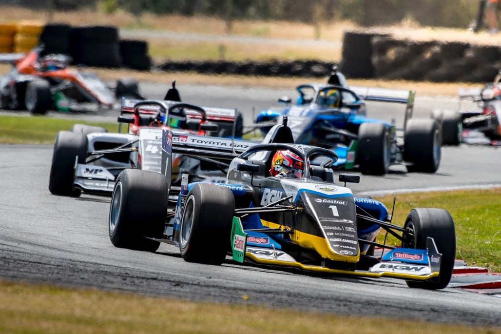 The subsequent safety car doubled as the end of the race — Lawson, Fraga, Tsunoda, Walls, Collet, Saucy, Petersson, Colapinto, José Blanco, and Petr Ptacek crossing the line in the top 10 positions. The series now travels to Hampton Downs for round three of the series next weekend.