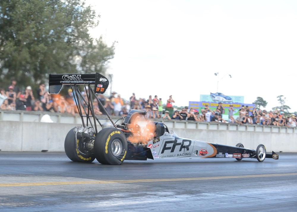 Reece Fish (above) ran 5.045s at 260.16mph in the opposite lane as the Saturday evening match-up provided the weekend's nitro racing highlight. Both teams ran into some engine problems while making Sunday runs until Fish made a late afternoon 5.012secs solo pass for a new personal best.