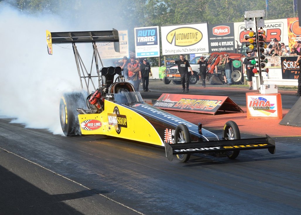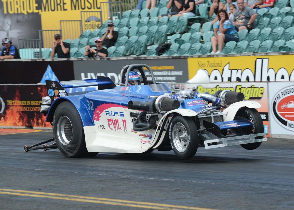 Late on Saturday afternoon, Top Fuel dragster driver Anthony Marsh (Auckland) made use of an expertly prepared Meremere track and some evening atmospheric conditions to blast his nitromethane-fuelled dragster down the quarter-mile in 4.872secs and pass through the top-end speed trap at 307.72mph.
