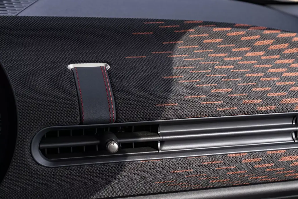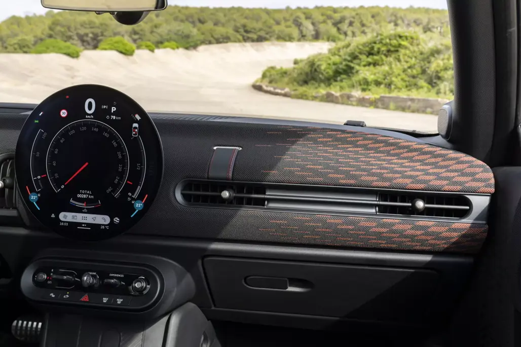 Inside, the JCW’s race-inspired interior features black vegan leather seats, accented with red stitching, and a central 240mm OLED display.