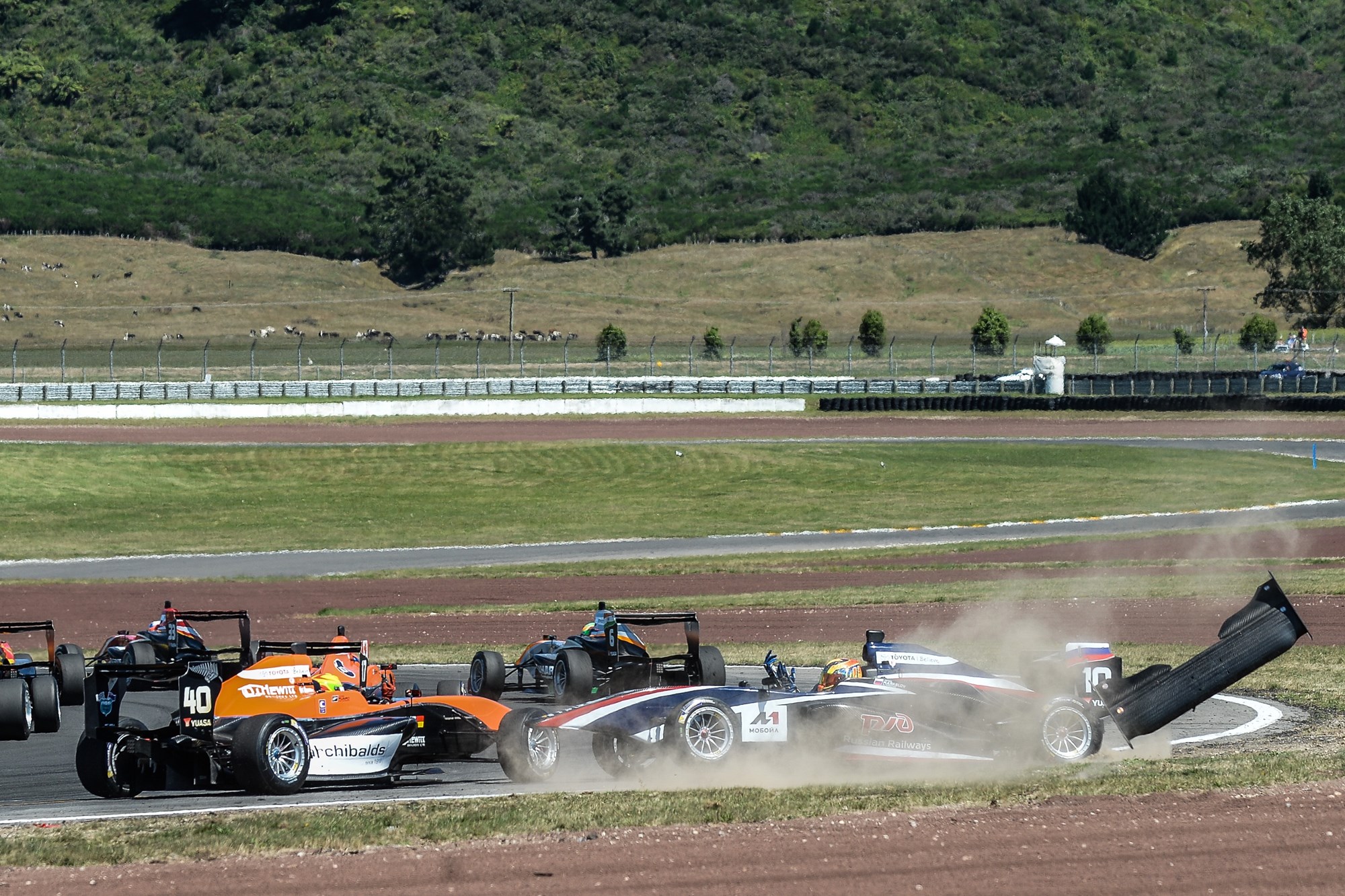 The drama continued in race three, when Christchurch's James Munro and Russia's Artem Markelov made contact at turn one of lap one — an angry Markelov gesticulating at the Giles Motorsport driver while still spinning backwards into the sand trap.