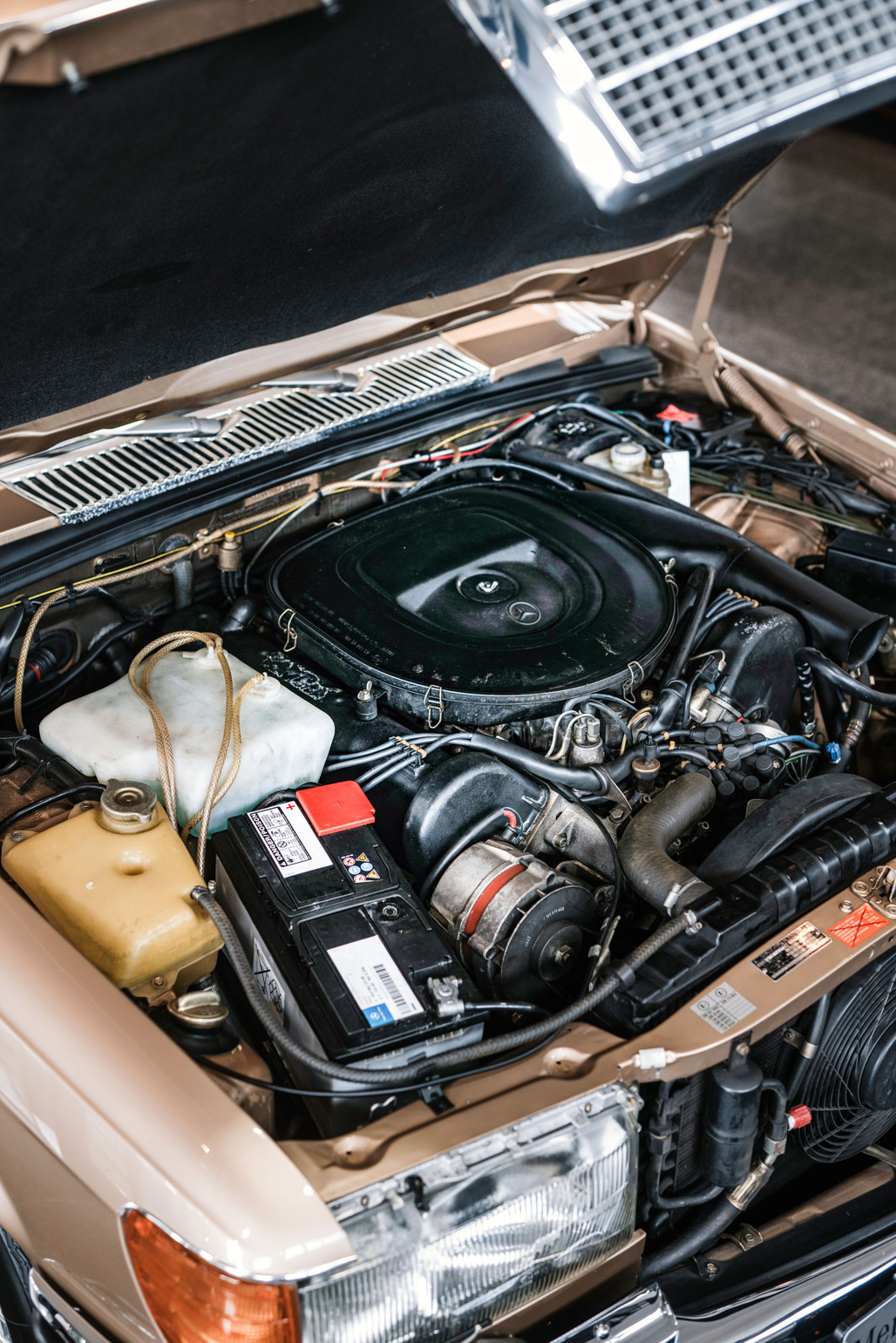 Under the bonnet sits the M100 E 69 V8, derived from the grand 600 (W100) limousine but bored out to a thundering 6.8L. That gave the 450 SEL 6.9 a hearty 210kW and 550Nm of torque - more than enough to justify its beefed-up 215/70 VR 14 tyres and oversized dual exhausts.