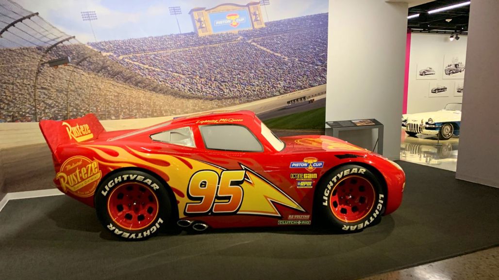 Lightning McQueen has been a permanent fixture of the Petersen Automotive Museum in Los Angeles, California. The fictional star race car's origins remain disputed, but he was designed to evoke Generation 4 NASCAR models with a combination of the Chevrolet Corvette, Dodge Viper, Ford GT40, among others.