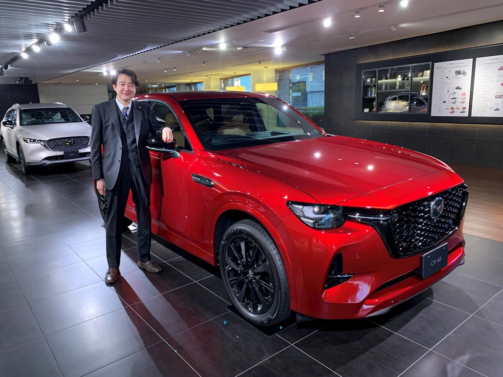 According to Kohei Shibata, Program Manager, Product Division (pictured next to red CX-60), the CX-60 is a refinement and evolution: “It’s smoother, with more intuitive acceleration,” he says. “The new 3.3-litre engine is bigger capacity while remaining fuel efficient… [it was] the most efficient displacement.”