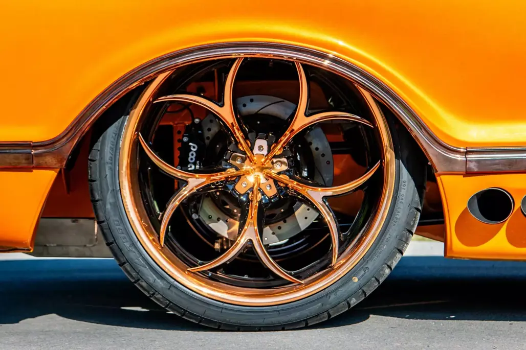 The exterior leans hard into visual theatre. The body is finished in Arancio California, an eye-searing orange borrowed from Lamborghini’s colour book, and paired with 22-inch rose gold and black wheels. Big Wilwood brakes sit behind them, ensuring the stopping power matches the intent.