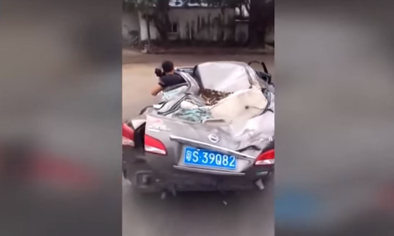 Somehow the man driving the car manages to fit into the vehicle which is near enough completely crushed.