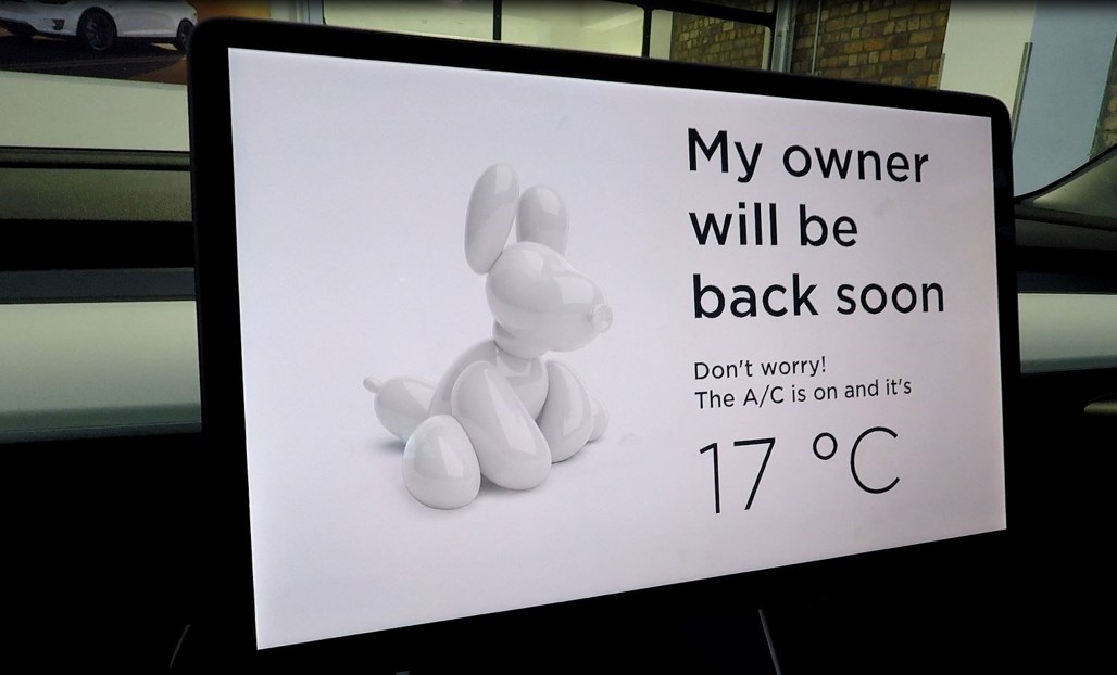 Via the air conditioning’s fan mode, you turn on “dog” setting, adjust the temperature and a large message on the screen says, “My owner will be back soon. Don’t worry! The A/C is on and it’s [temperature]”.
