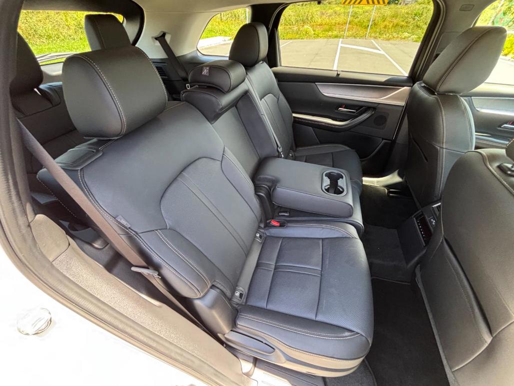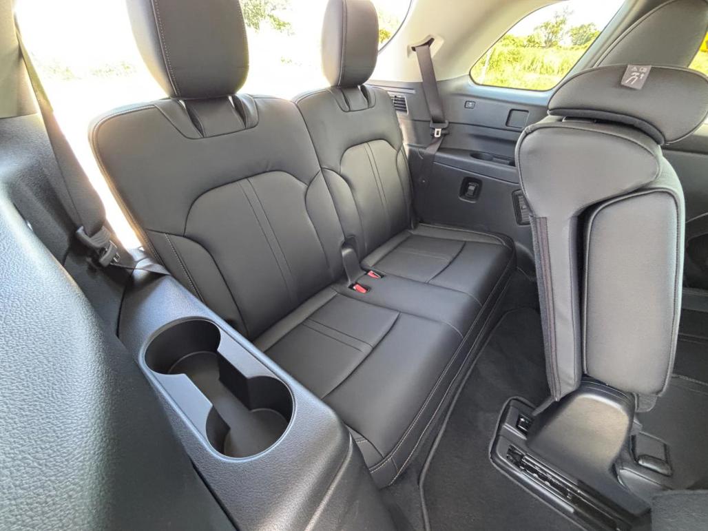 The second row has its own climate control, leather, and extras like side sin blinds, triple cup-holders in the doors, and fold-down centre armrest with two more cupholders. It also has a one-touch button on the seat’s side to easily access the third row, one press releasing and (manually) sliding the bench and flipping the backrest forward and opening up a large access area to the rear.