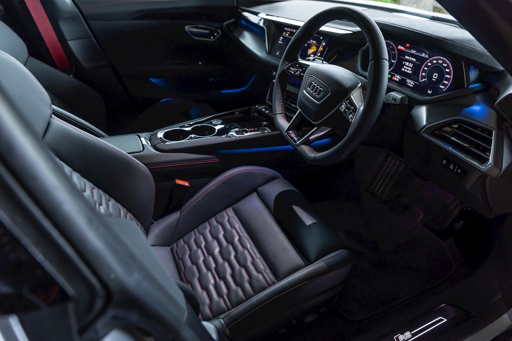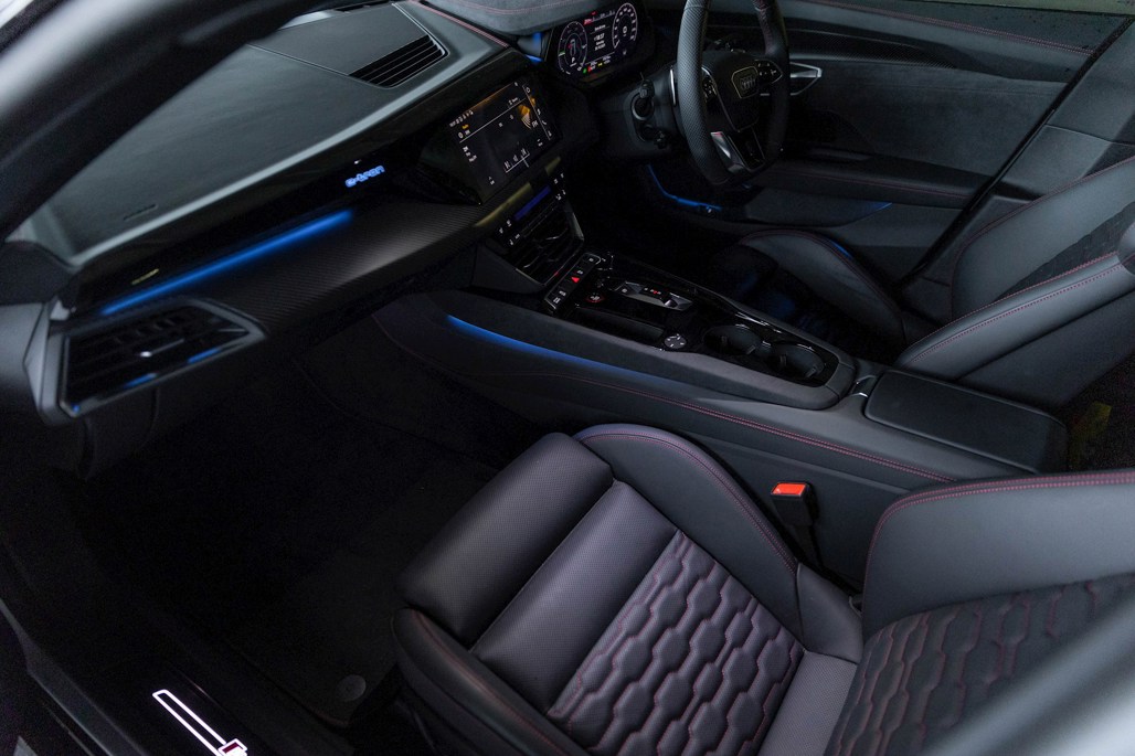 Inside, the RS e-tron GT doesn’t go for a massive dash-mounted touchscreen like some BEVs; instead, it gets a reasonably sized one that sits above the climate control buttons. The small gear selector is strange to use at first, but becomes second nature in time. The bucket seats are extremely comfortable on long trips, but also do their job of holding a driver in well.