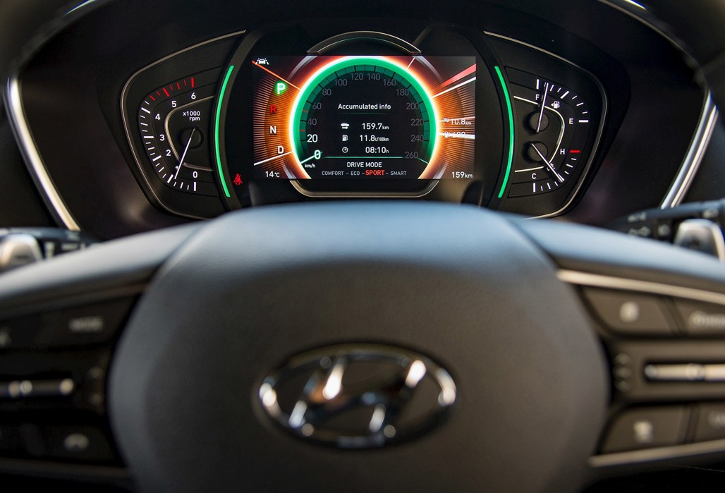 The difference is that the latest Santa Fe comes with an extra layer of electronic features, including a Wi-Fi-independent app that’ll allow you to monitor it by remote control from your phone. Add that to other new tricks like rear-seat occupant alert (prevents you leaving a pet or a child in the locked car to cook), safe exit assist, front and rear collision avoidance assist, blind-spot avoidance assist, and a host of others that comprise a package Hyundai calls Smartsense, and there’s little doubt that this is a highly artificially-intelligent new SUV.