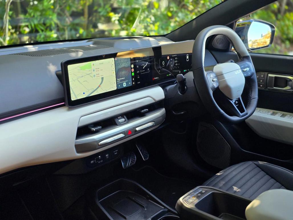 In contrast to its wild exterior, the EV4's cabin is a far more traditional and restrained place with sensible, modern ergonomics. It follows the pattern of other Kia EVs, featuring a large panoramic screen that stretches from behind the steering wheel to the centre of the dash, housing the digital cluster and infotainment system.