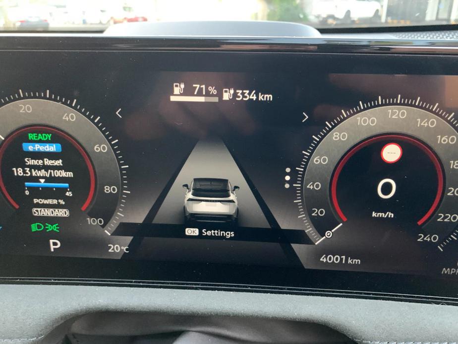 The driver interface carries a practical set of conventional style circular gauges that offers a lot of key info like battery and range and speed in clear displays, and three pages of consumption. Our week with Ariya, mixing a lot of less-efficient motorway, still managed around 16-18kW/100km which is quite good for its size and better than its claim of 18.1 – but where Ariya really excels is the e-pedal regeneration, which works very effectively at low or high speeds: most impressively, it reeled back 10km from the southbound run down the Bombay Hill, whereas most EVs regen around 3-5km and quitely goes about its business of putting power back into the battery without having to think about it.