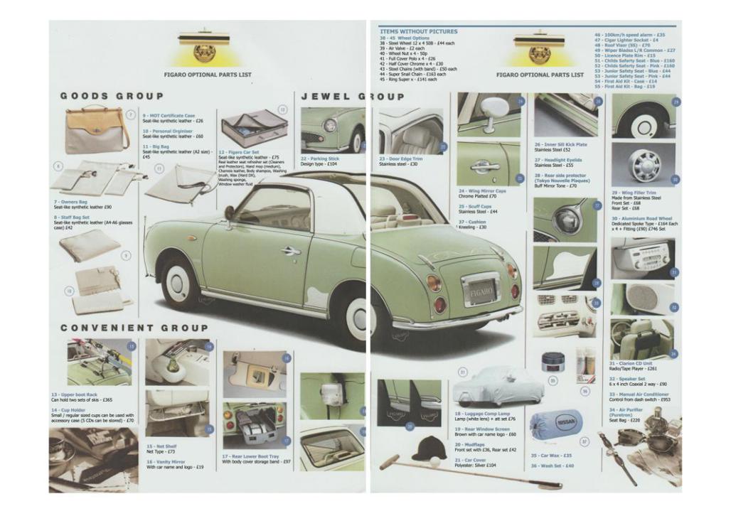 When Nissan launched the Figaro in 1991, it was part of the postmodern Pike car collection. And with such a cute, kitschy appearance, it would naturally lend itself very well to the idea of personalisation through accessorising. Way more than just floor mats and a weather shield, Nissan made available a whole range of cool, quirky, practical and sometimes wholly weird and unnecessary factory accessories to customise and personalise a Figaro.