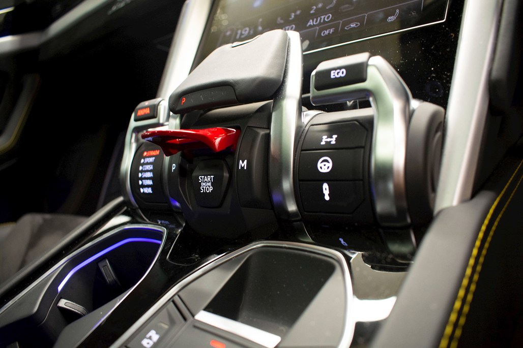 Inside the cabin, there is a nice combination of Lamborghini, including the start/stop button button hidden beneath the usual flip-up fighter jet cover. I love that touch.