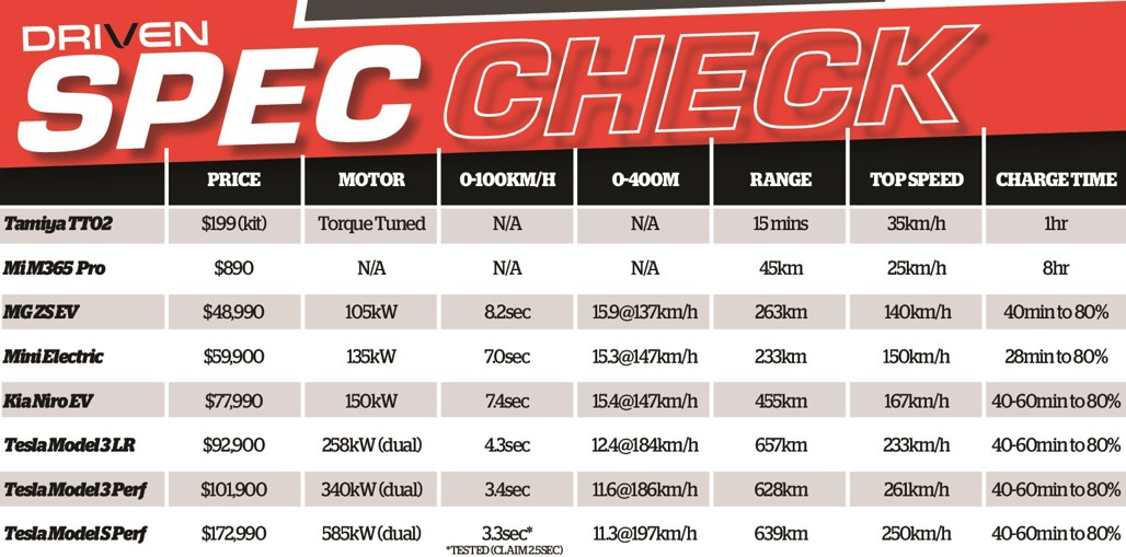 Once that race was won, we turned our attention to the full-size cars. We’ll save the races and results for the video, but we’ve prepared a rundown of the rivals, and specs of the competitors of DRIVEN’s first EV shootout. Scroll to the gallery below for the full specification table.